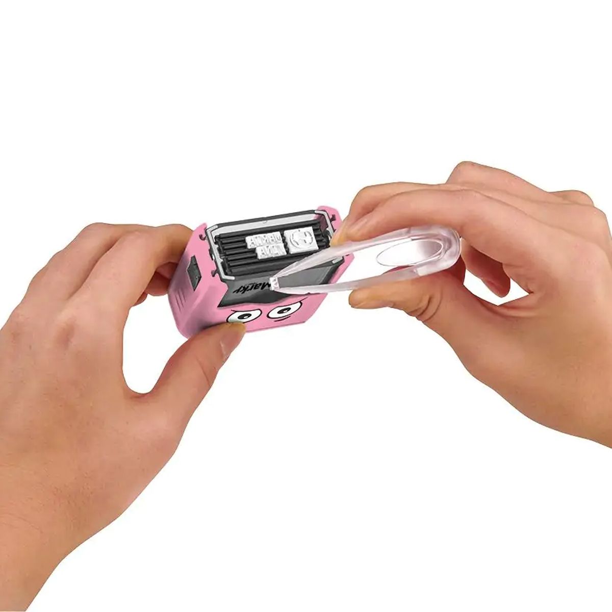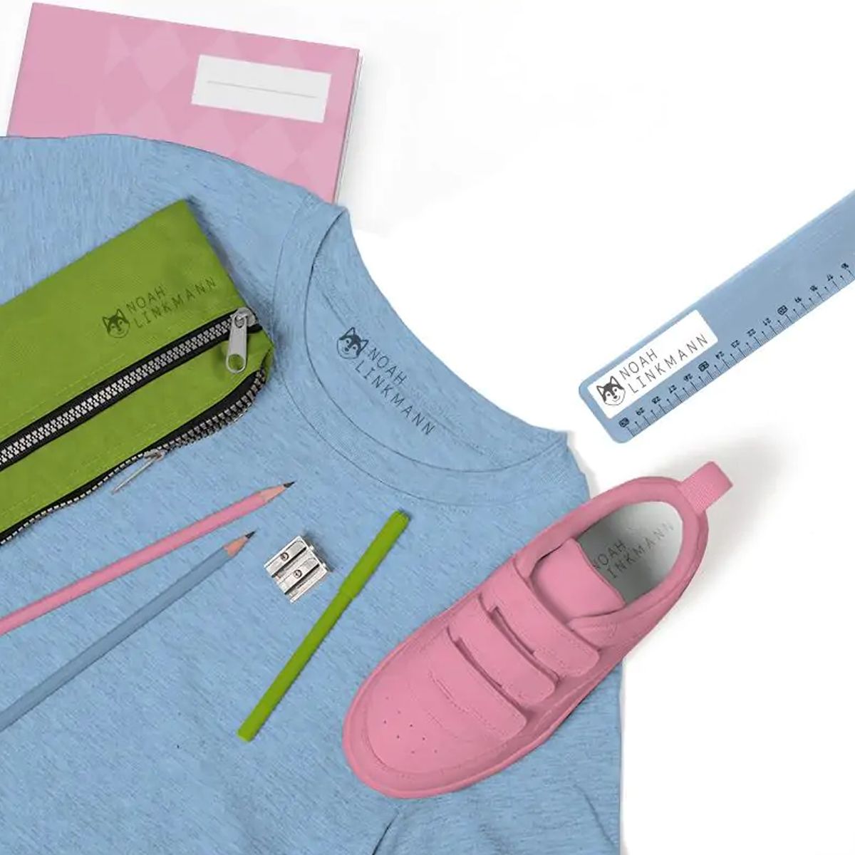 Basta con sacar Marky del envoltorio, quitar la tapa y utilizar las pinzas incluidas para colocar fácilmente las letras y pictogramas contenidos en el juego de caracteres para crear la impresión deseada. Una clara ventaja, sobre todo para las familias con varios hijos, es que se puede rediseñar y personalizar una y otra vez en pocos minutos. La almohadilla de tinta negra con tinta textil ya está insertada en el sello. MARKY puede utilizarse directamente sobre tejidos claros, papel, cartón, zapatos y todas las superficies absorbentes. Para personalizar tejidos oscuros, el set incluye una cinta térmica para planchar de 1 metro de longitud, que se plancha después de estampar. Botellas de bebida, fiambreras, bolígrafos, tijeras y muchos otros artículos escolares que no se pueden estampar directamente se pueden personalizar con las etiquetas MARKY. Las etiquetas pueden meterse en el lavavajillas junto con la botella y los demás artículos.